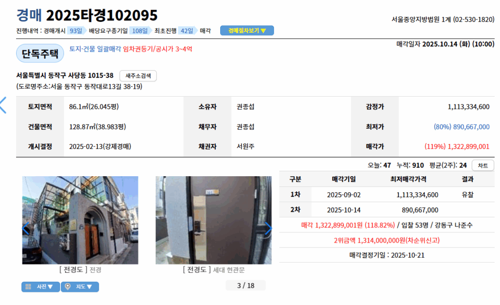 서울 동작구 사당동 재개발 단독주택이 감정가(11억 1,000만원)의 119%인 13억 2,000만원에 낙찰되었습니다. 입찰자 53명이 몰릴 정도로 경쟁이 치열했습니다. 이렇게 돈 되는 물건을 소유자는 왜 경매로 내놓았을까요? 무슨 이유로 직접 팔아서 해결하지 못했을까요? 이번 글에서는 압류해제, 강제경매 등 재개발 지역 경매의 진짜 이유를 분석합니다.